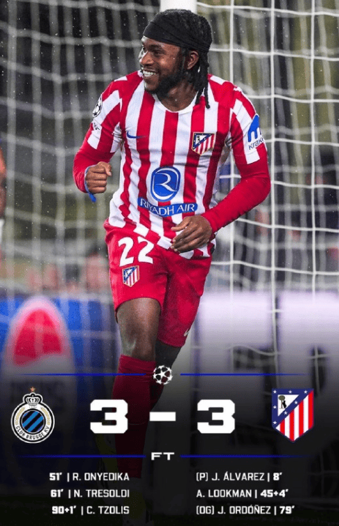 2025-26赛季欧冠1/8决赛附加赛首回合马德里竞技客场3比3比利时劲旅布鲁日,这场比赛也是够冷的, 不过次回合回到主场还是有一定优势的,只是防线的问题需要解决。令人担忧的是,这场平局延续了马竞近期的低迷态势,球队各赛事近4场仅取得1场胜利,攻防两端的诸多问题被无限放大,两周后的次回合较量,西蒙尼的球队绝对不能先失球。